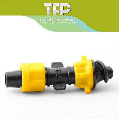 این اتصال تولید صنایع پلیمری تیران بسپار (TFP) است که برای اتصال های نوار های آبیاری به لوله های نخدار تاشونده پلی فِلَت و لِی فلت مورد استفاده قرار می گیرد. این شرکت یکی از معتبرترین شرکت های تولید کننده لوله و اتصالات کشاورزی با کیفیت در ایران است. مهره گیرنده نوار در این محصول از اتصال جدا نمی شود و در زیر چگونگی استفاده توضیح داده شده است.