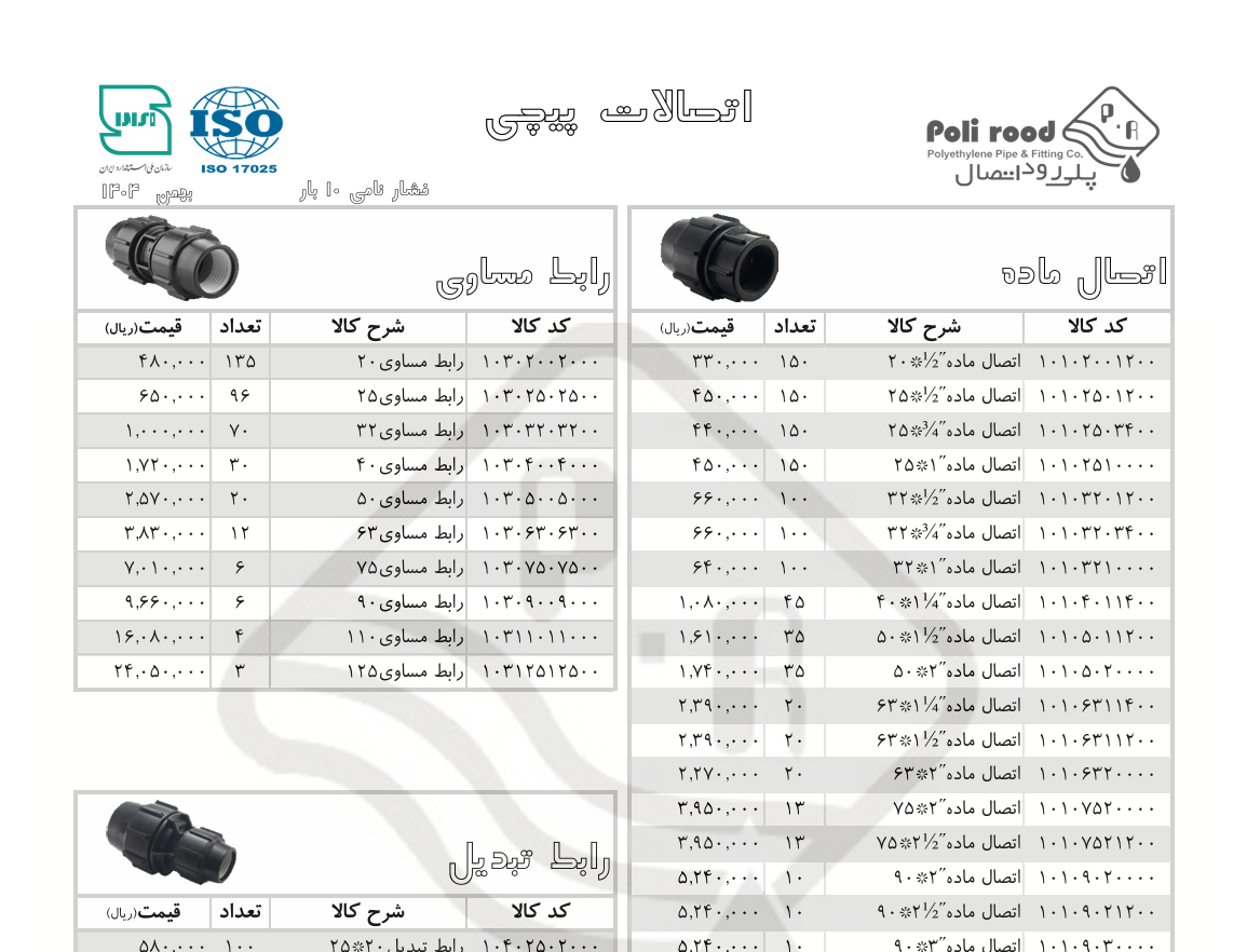 لیست قیمت محصولات پلی رود اتصال (بهمن 1404)